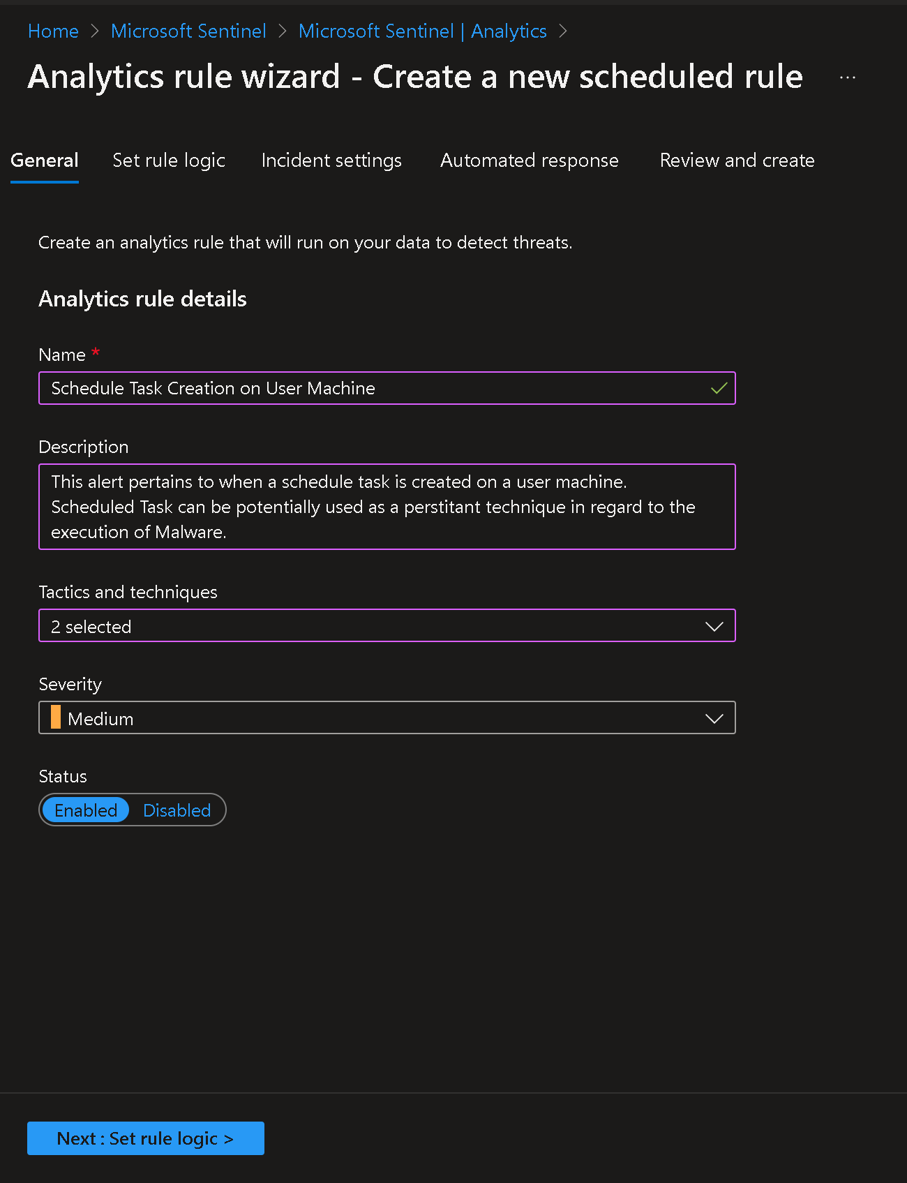 Lastly, we need to write some KQL logic to alert us when a scheduled task is created.