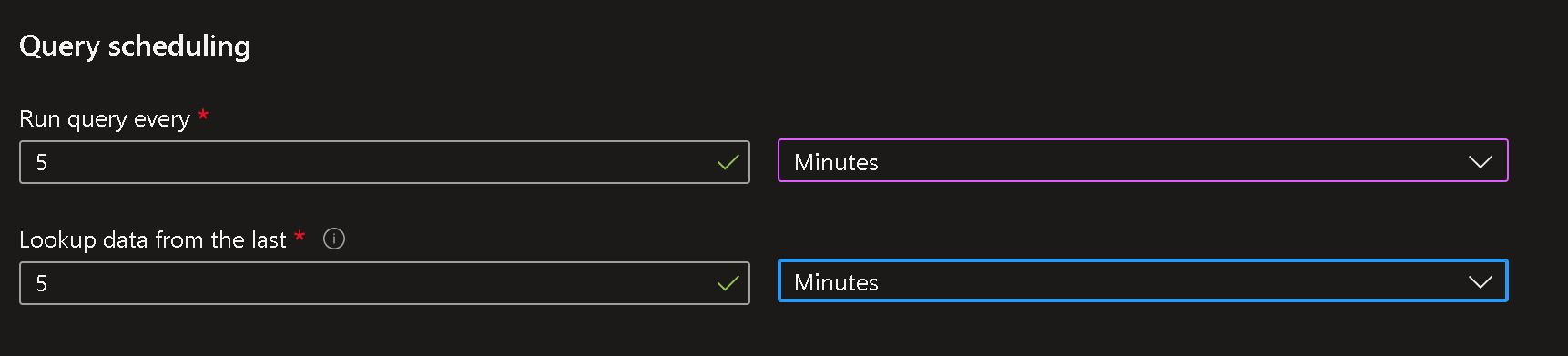 The only other setting that need to be changed for the purposes of this lab is how often the query is run and when to look up the data. Change defaults to the following: