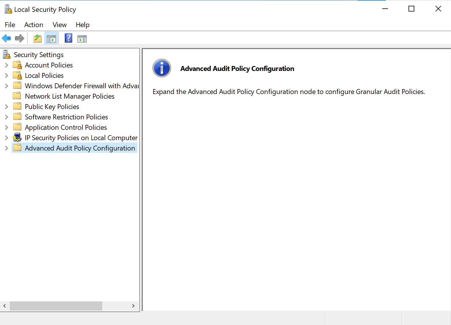 Search for “Local Security Policy” in Windows 10 VM and expand “Advanced Audit Policy Configuration”