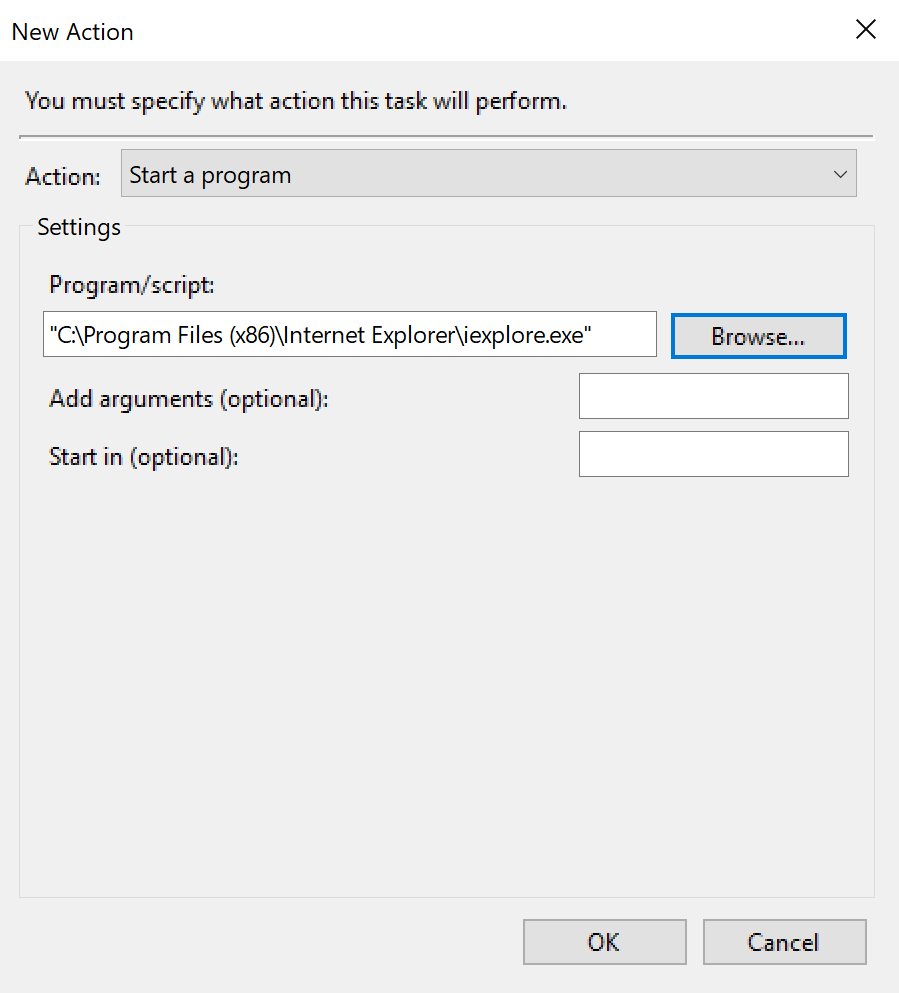 Then open program or script and select a program to run every time this task runs. I will select Internet Explorer.