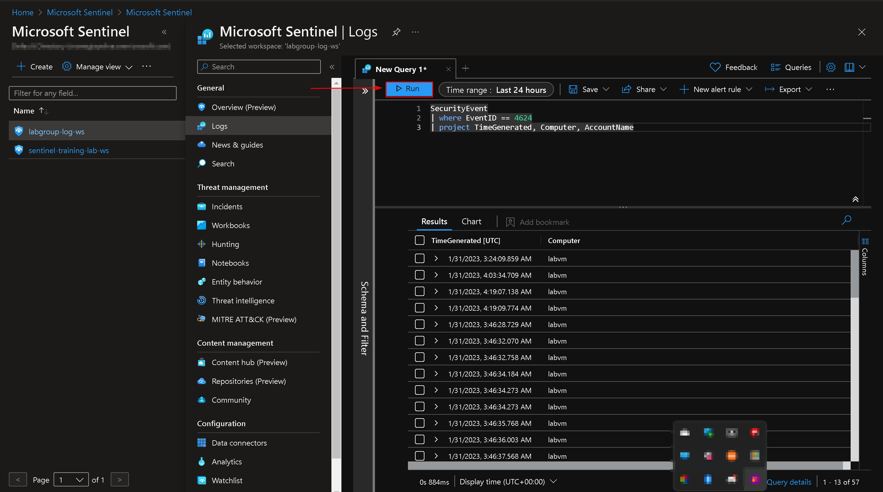 | project TimeGenerated, Computer AccountNameEvery SIEM has a search language that makes it simple to extract data from Logs. In Sentinel, that language is called KQL or Kusto Query Language. While there are many different syntax rules and ways to construct queries in KQL we will be using a few basic KQL commands to extract the data and write our analytics rule later in the lab.
