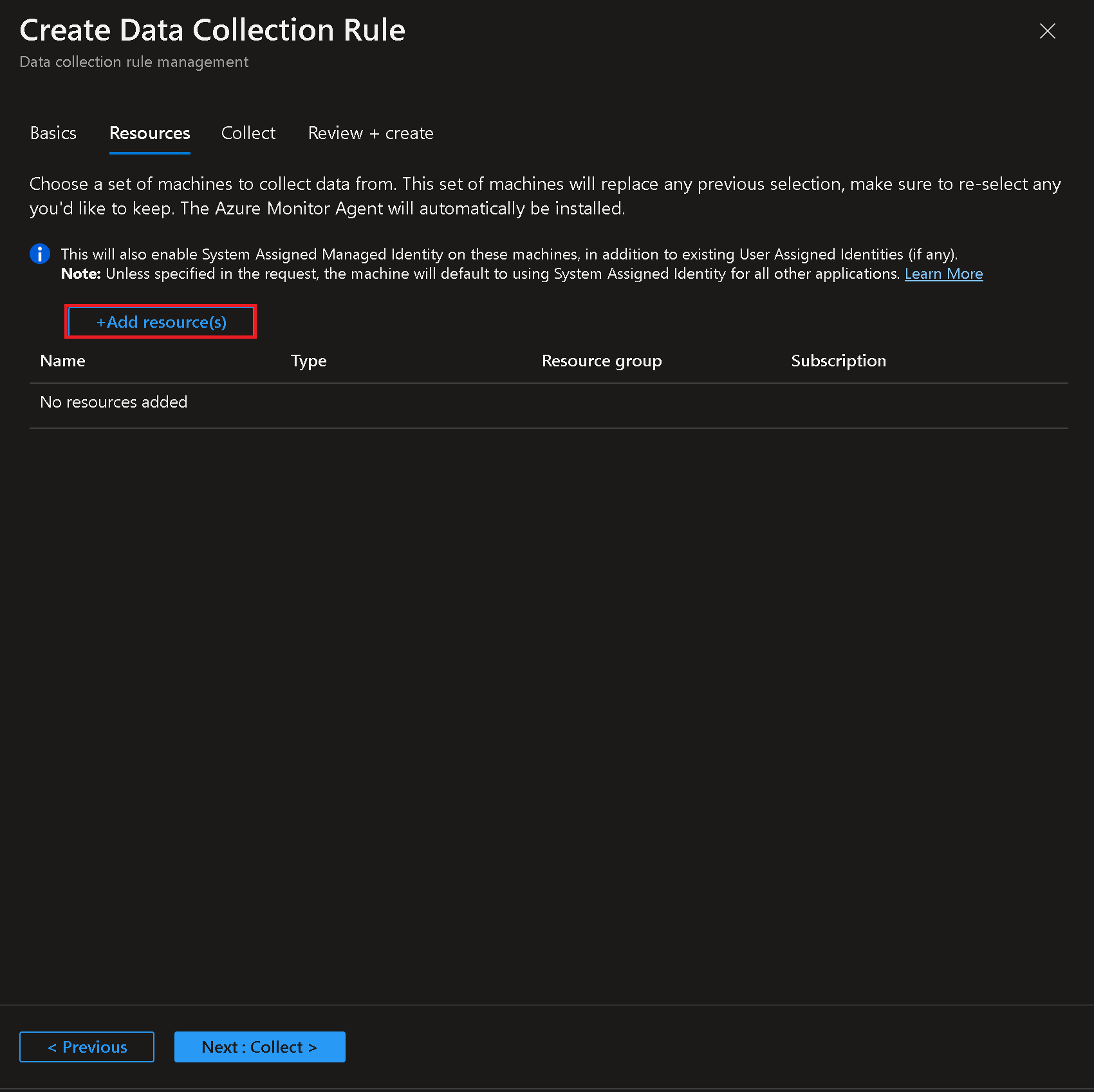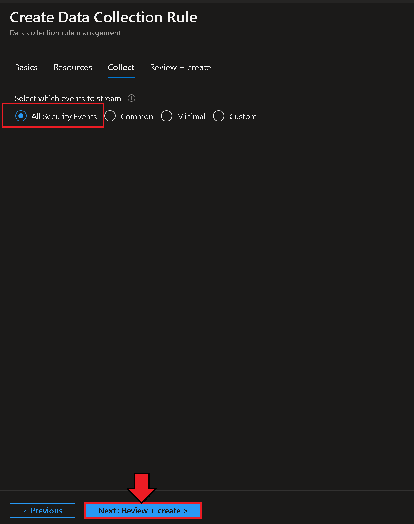 Now we will choose the 'Collect' tab to then choose to select “All Security Events” radio button. Once the 'All Security Events' option is selected, we can now choose 'Next: Review + Create'.