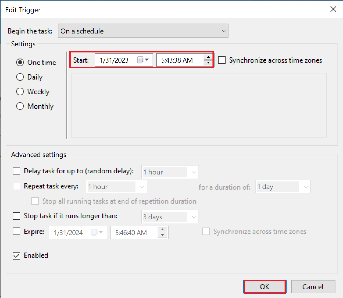 Navigate to triggers and click “new” and schedule the task for a time close to your current time. Then select “OK”