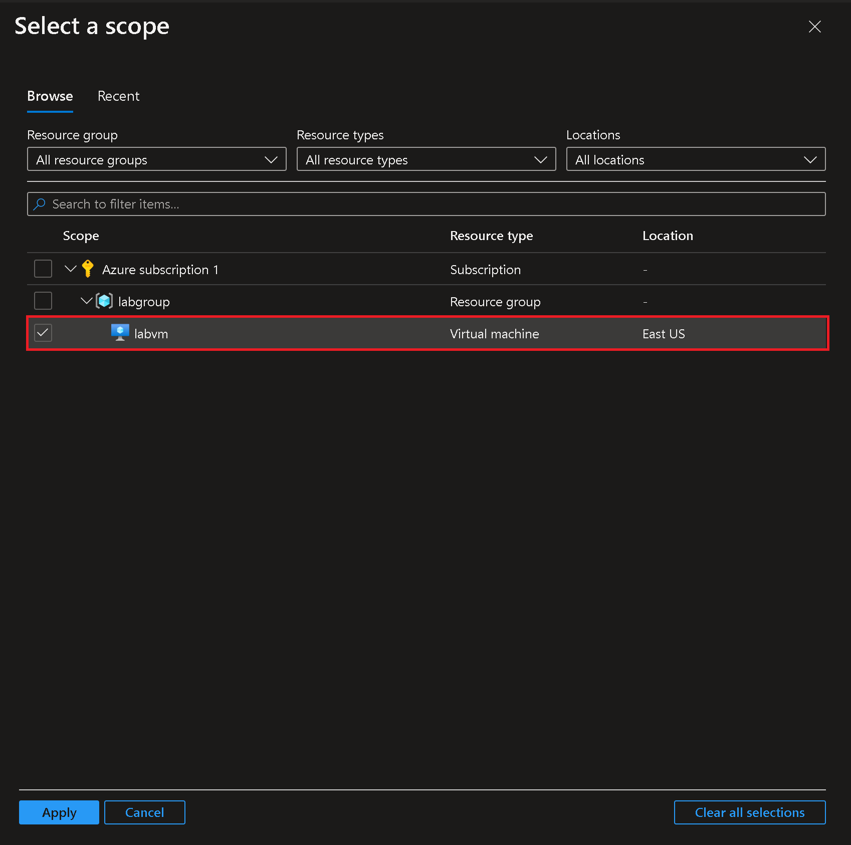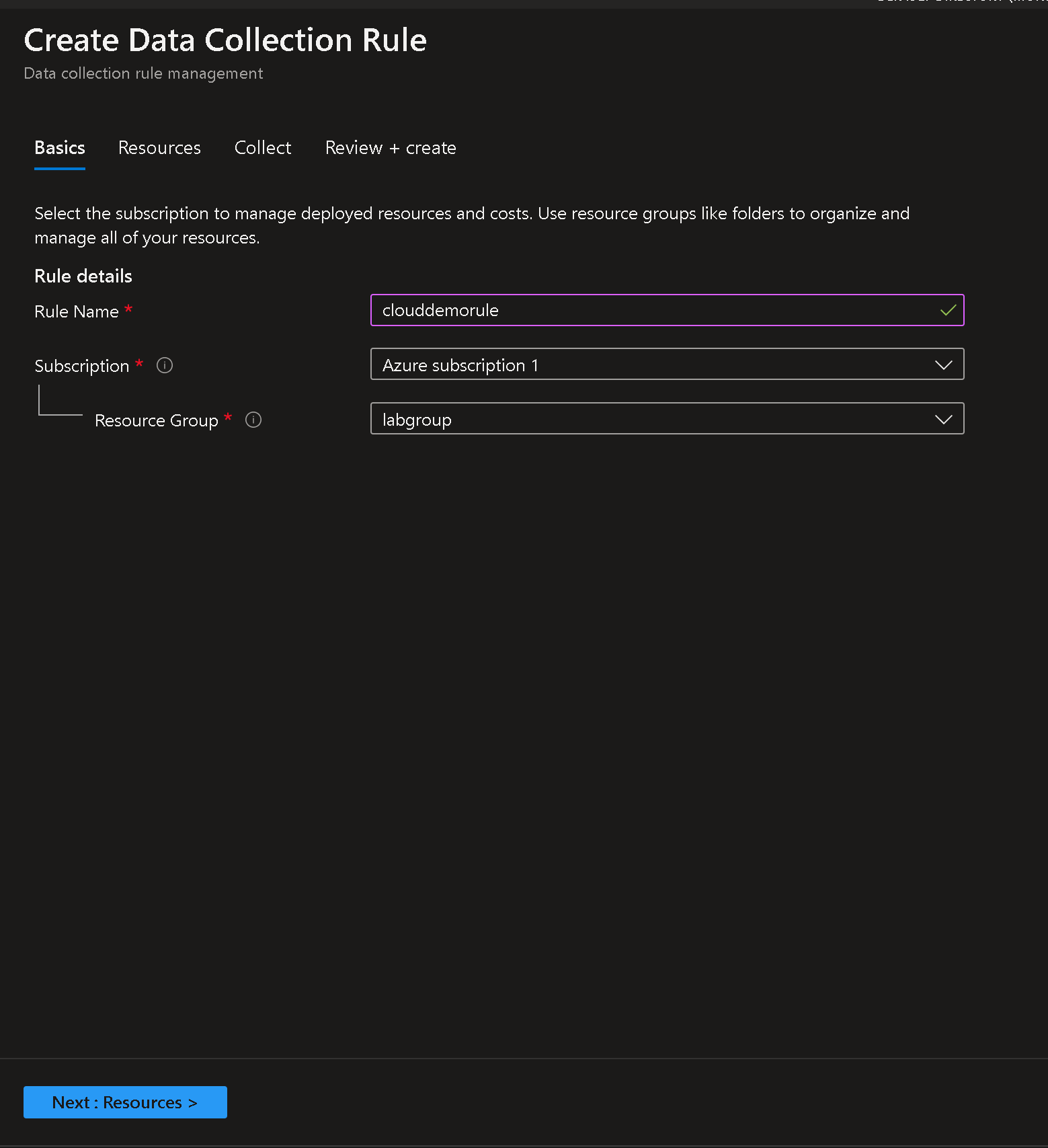 Give your rule a name and connect to it your resource group we have used for all resources thus far.