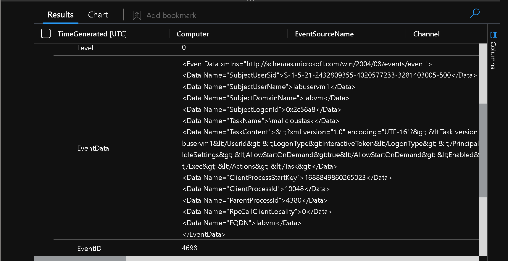 | where EventID == 4698This query will pull instances of scheduled task creation as shown here in our logs.
