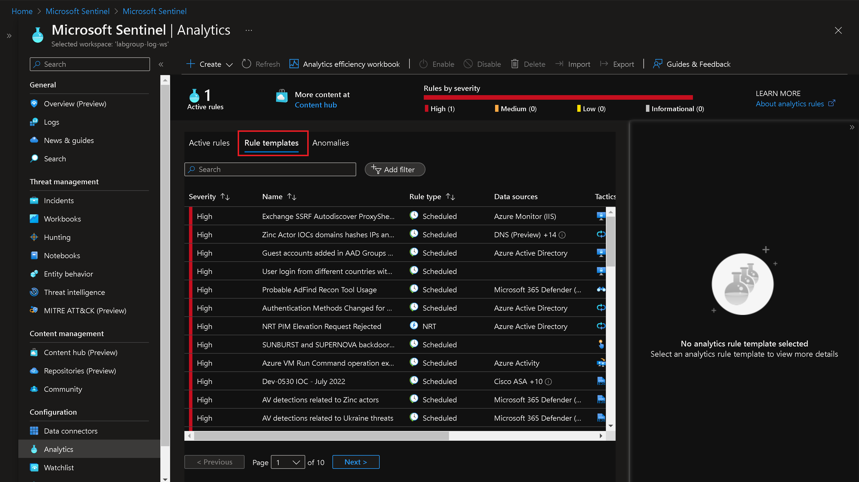 These are a list of alerts that we can enable our SIEM to monitor that come out of the box. If you wish, you can expand some and see what they are comprised of by clicking create a rule and following the onscreen tasks to see the rule logic and as well as enabling the rule. However, the rules will only fire if the logic is met by a security event on your VM.