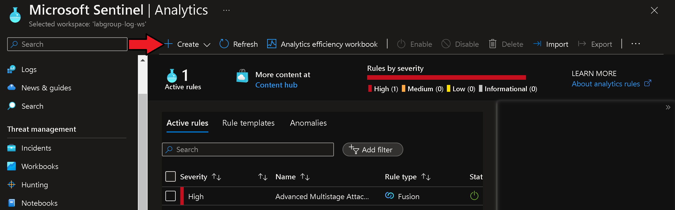 Go to the sentinel Home Page and click “Analytics Rules” and click create at the top of the page and select the scheduled query option.