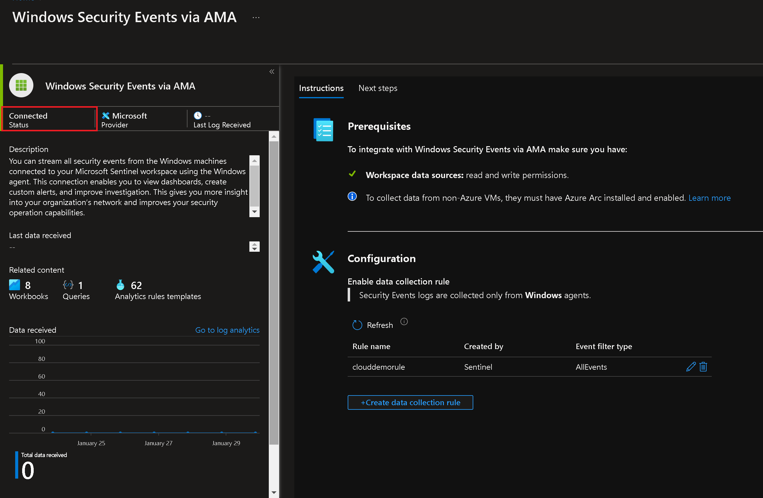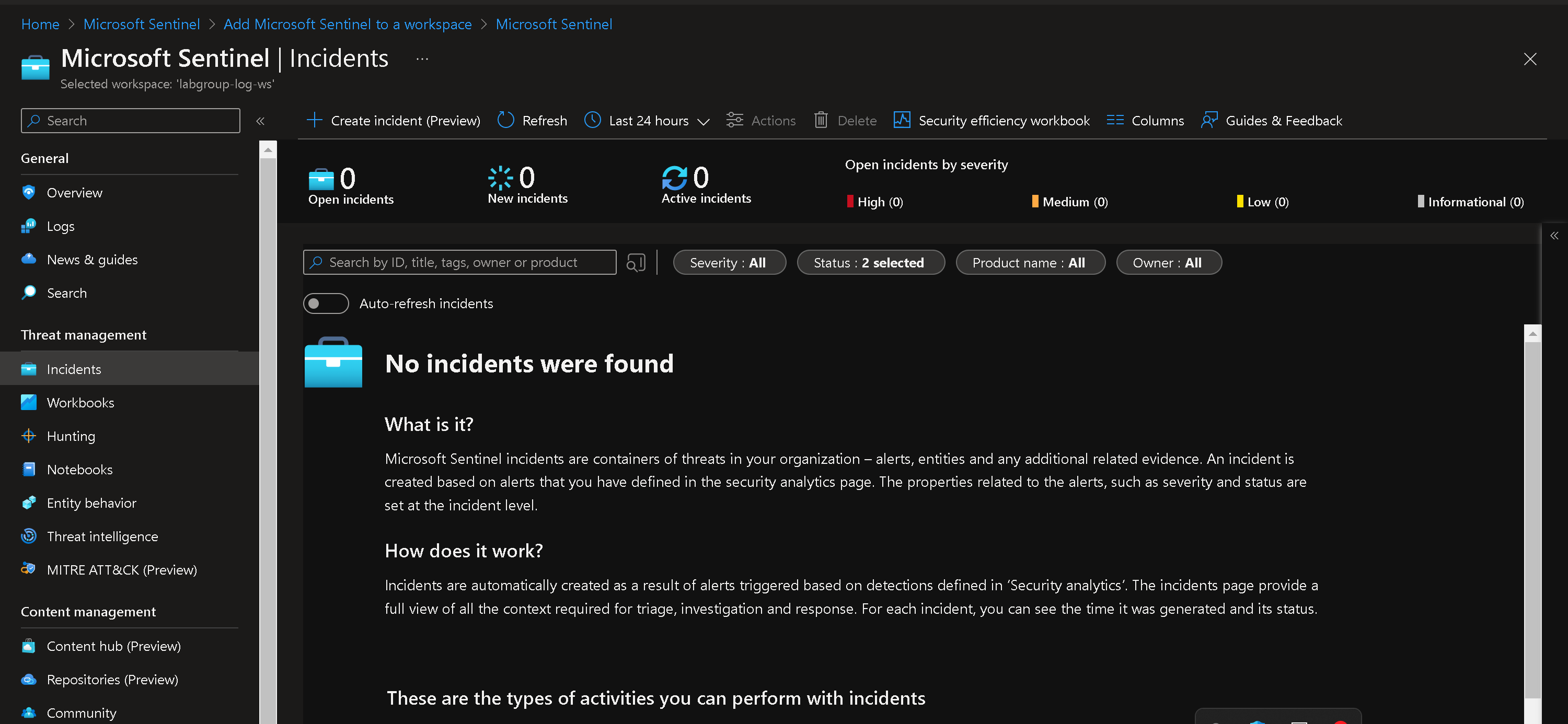 After the Sentinel Deployment, if we go to the incidents tab on the left we see that we don’t have any incidents currently as there is no data being fed into Sentinel. Next, we are going to utilize data connectors and create a data collection rule to bring in data from our Windows 10 VM.