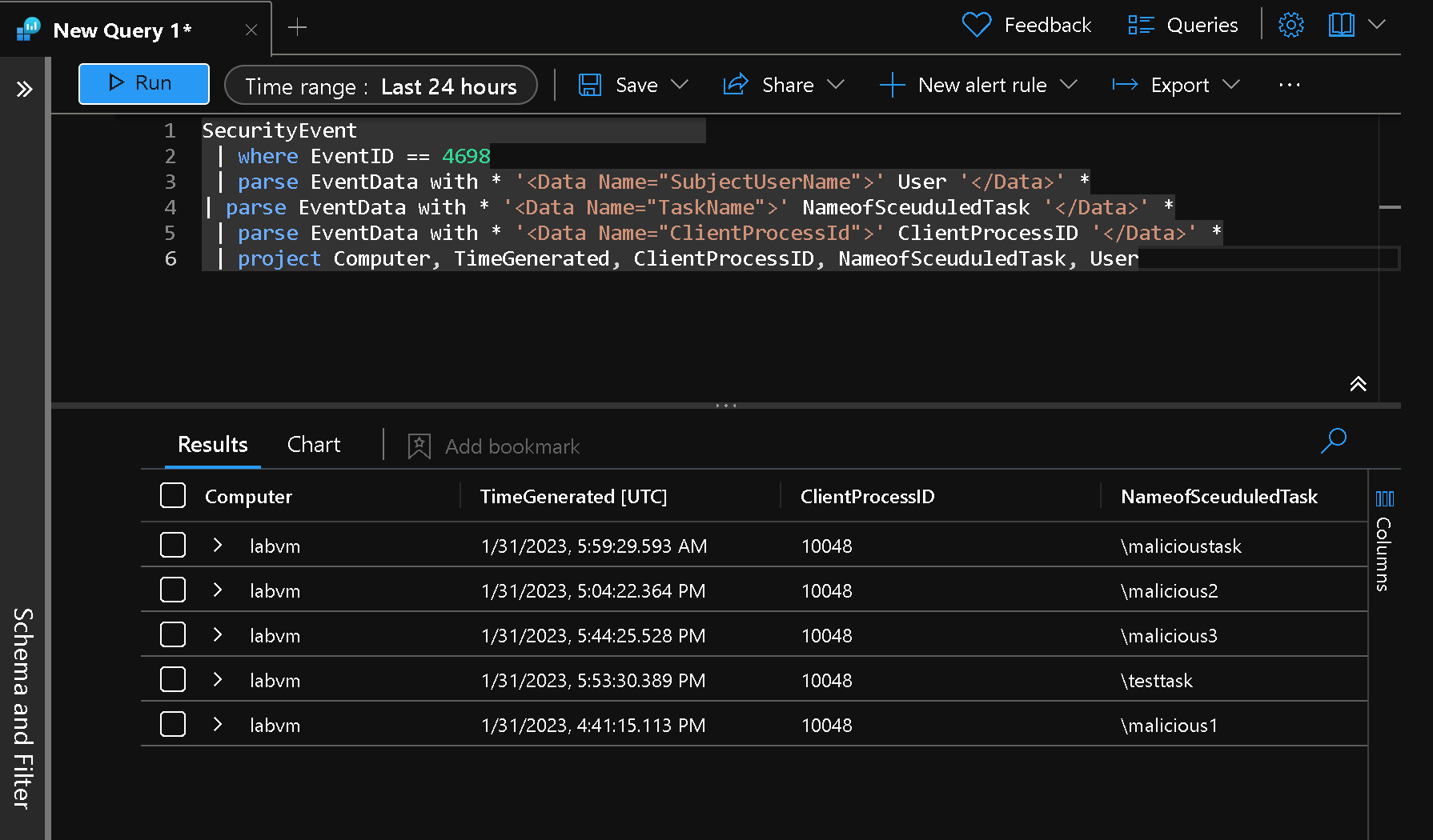 | project Computer, TimeGenerated, ClientProcessID, NameofSceuduledTask, UserThe Parse command will allow us to extract data from the Event Data Field that we find important.