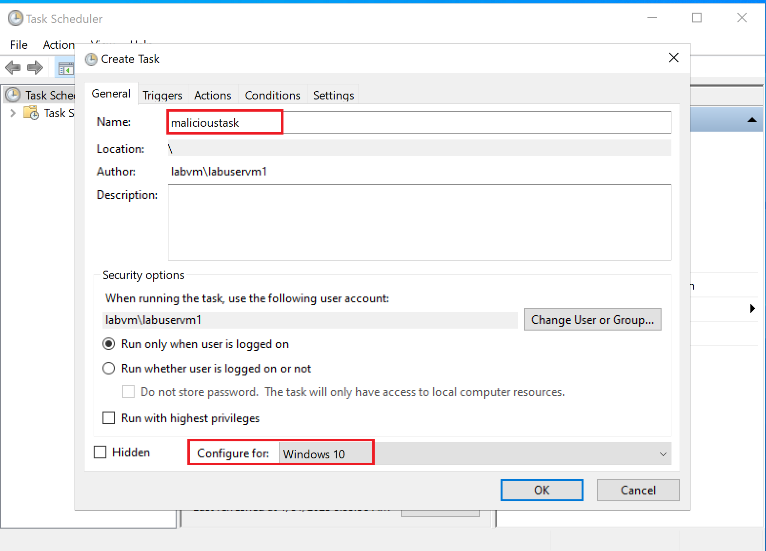 Open Windows Task Scheduler and navigate to “Create Task” . Add a name and change the “Configure For” Operating system to Windows 10.