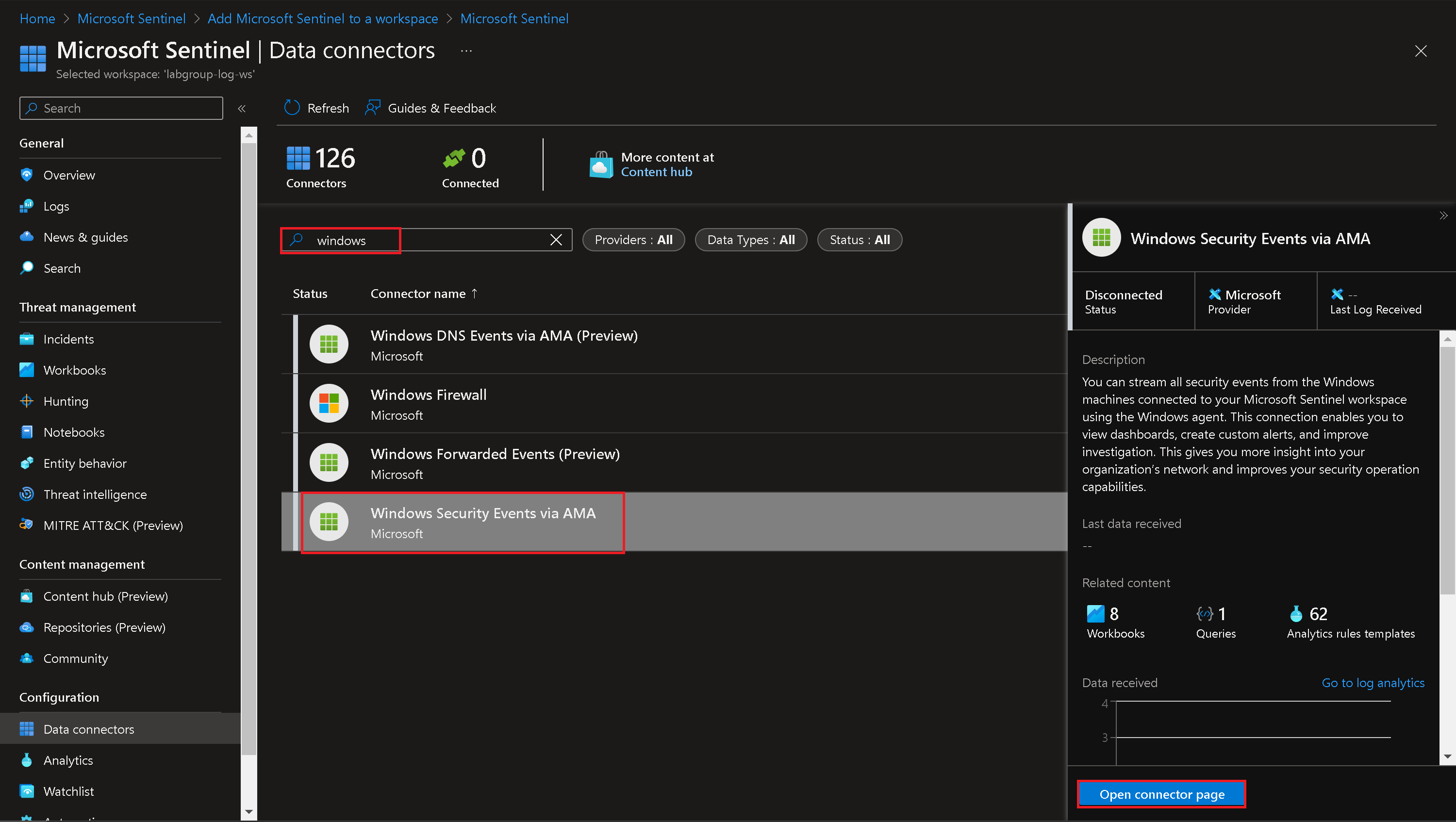 In the Search bar type in “Windows” and you will see Windows Security Events via AMA. Select that option and click “Open Connector Page”.