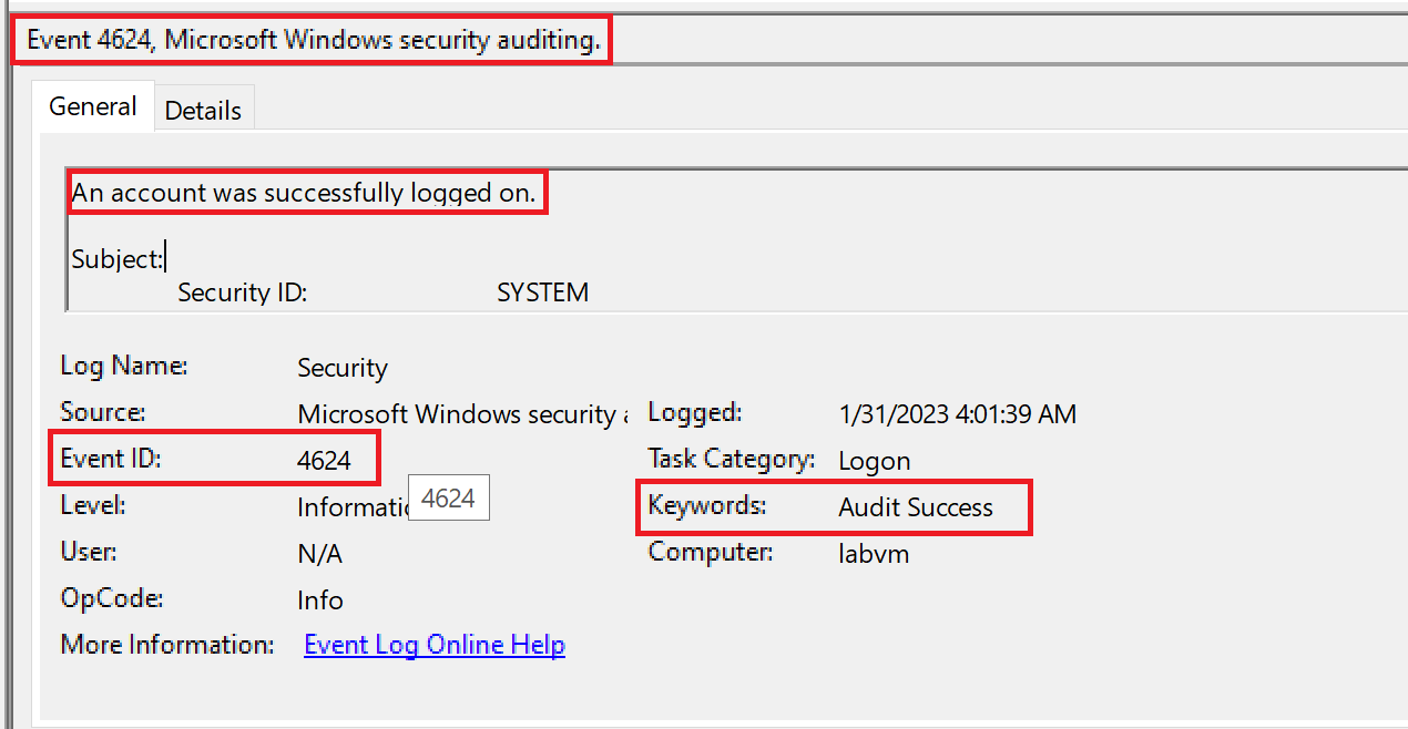 When we select event 4624 we see that 4624 ID is indicative of a successful logon. We can also examine more detailed information about the logon if need be.
