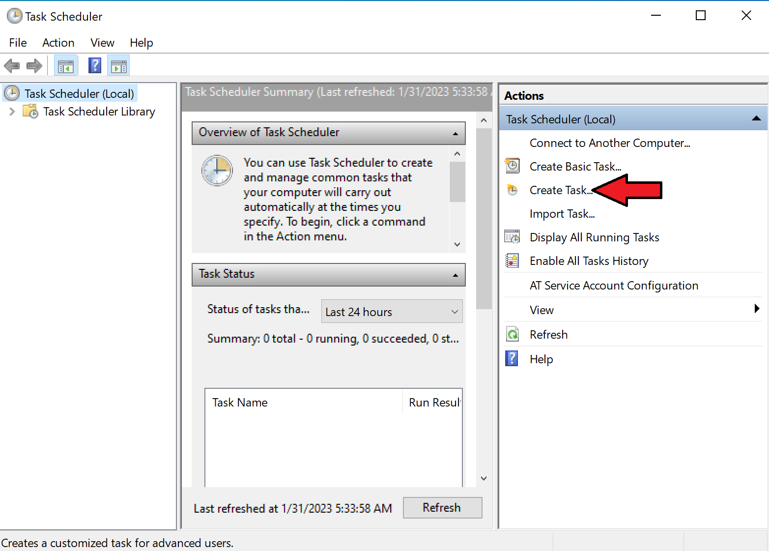 The final part of this lab is to create our own custom rule to detect potentially malicious activity on our VM. In Windows Task scheduler you have the option to create a scheduled task. A scheduled task is essentially a way to automate certain activities on your machine .