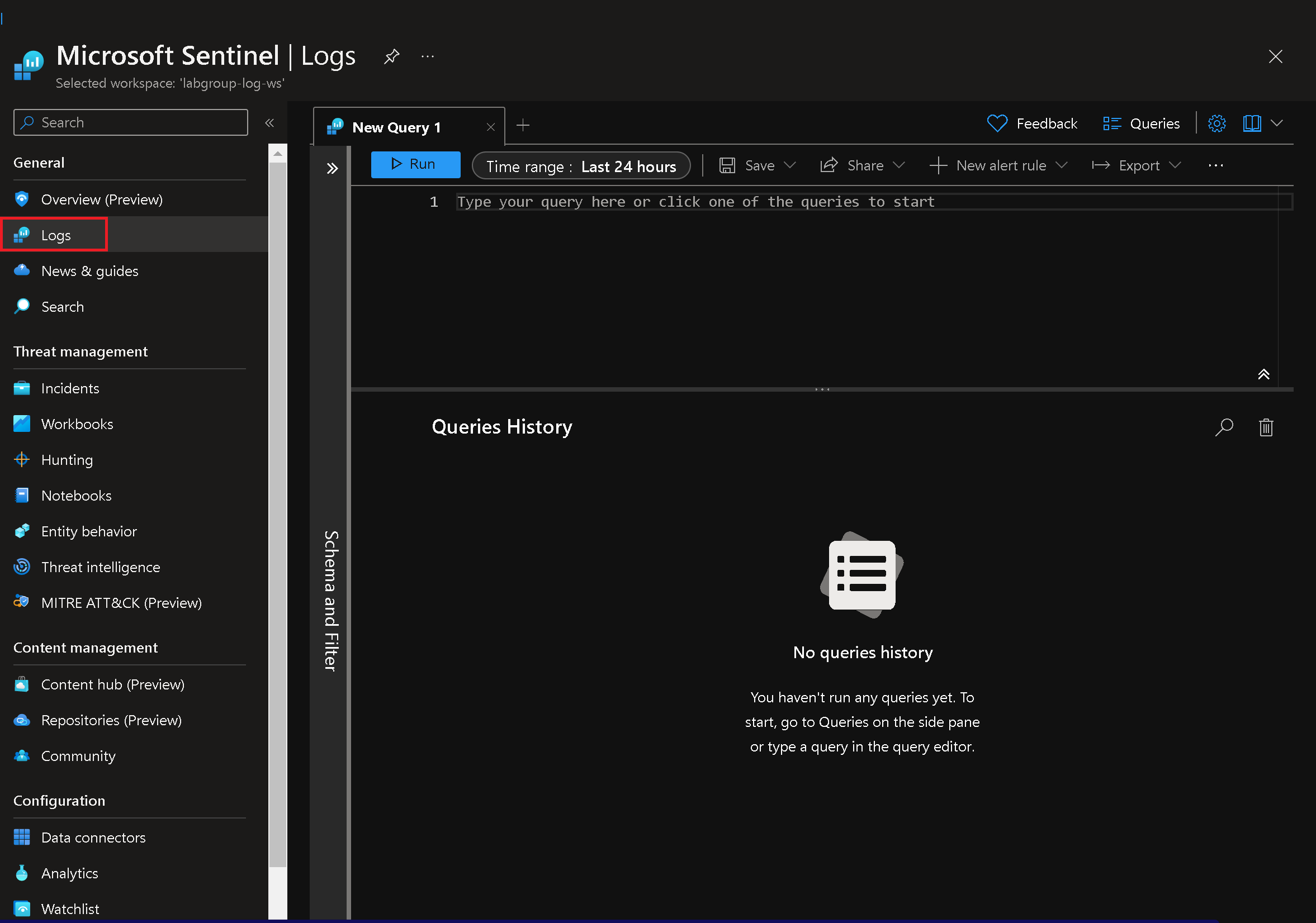 In the section where it says “Type your query here or click one of the queries to start” we are going to use the following KQL (Kusto Query Language) Logic: