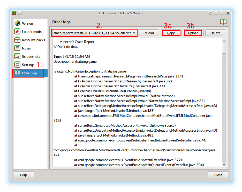 - Either on the console window directly after the crash, or in the Edit Instance dialog any time after the crash, click on Other logs