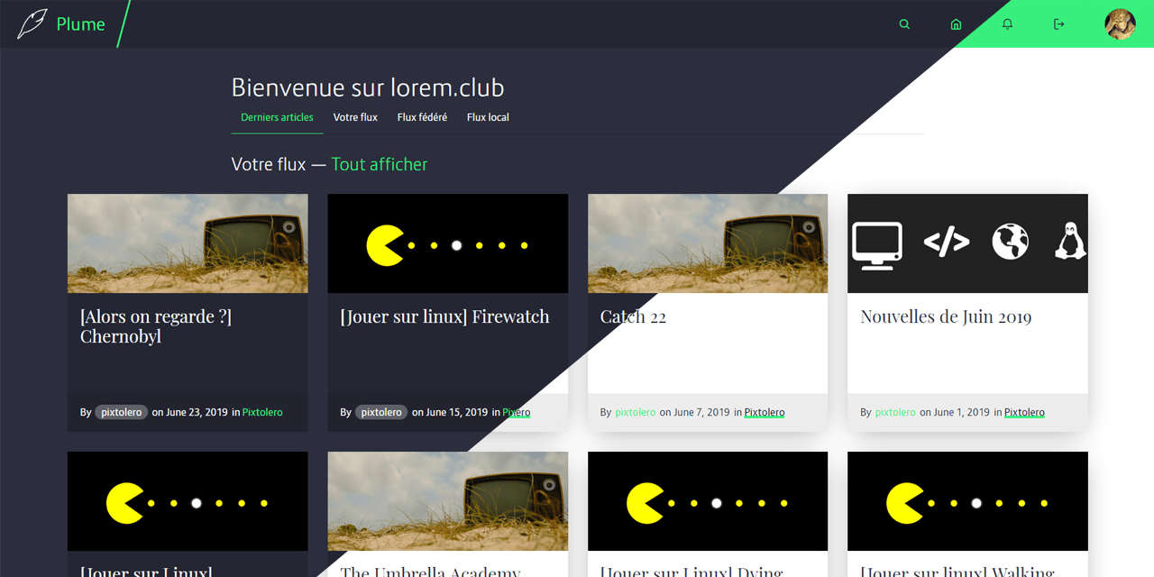 This theme exists in both light and dark versions. Both of them have a vivid green as accent color.