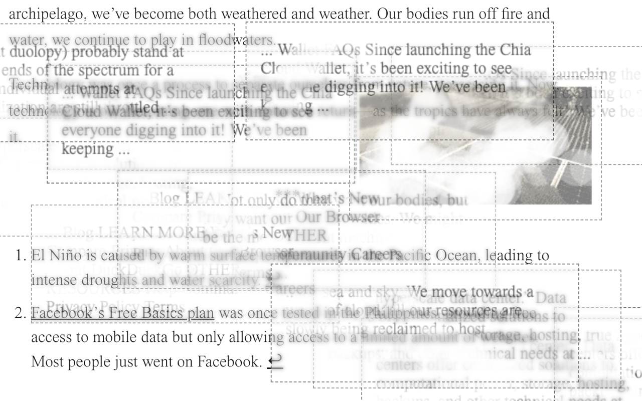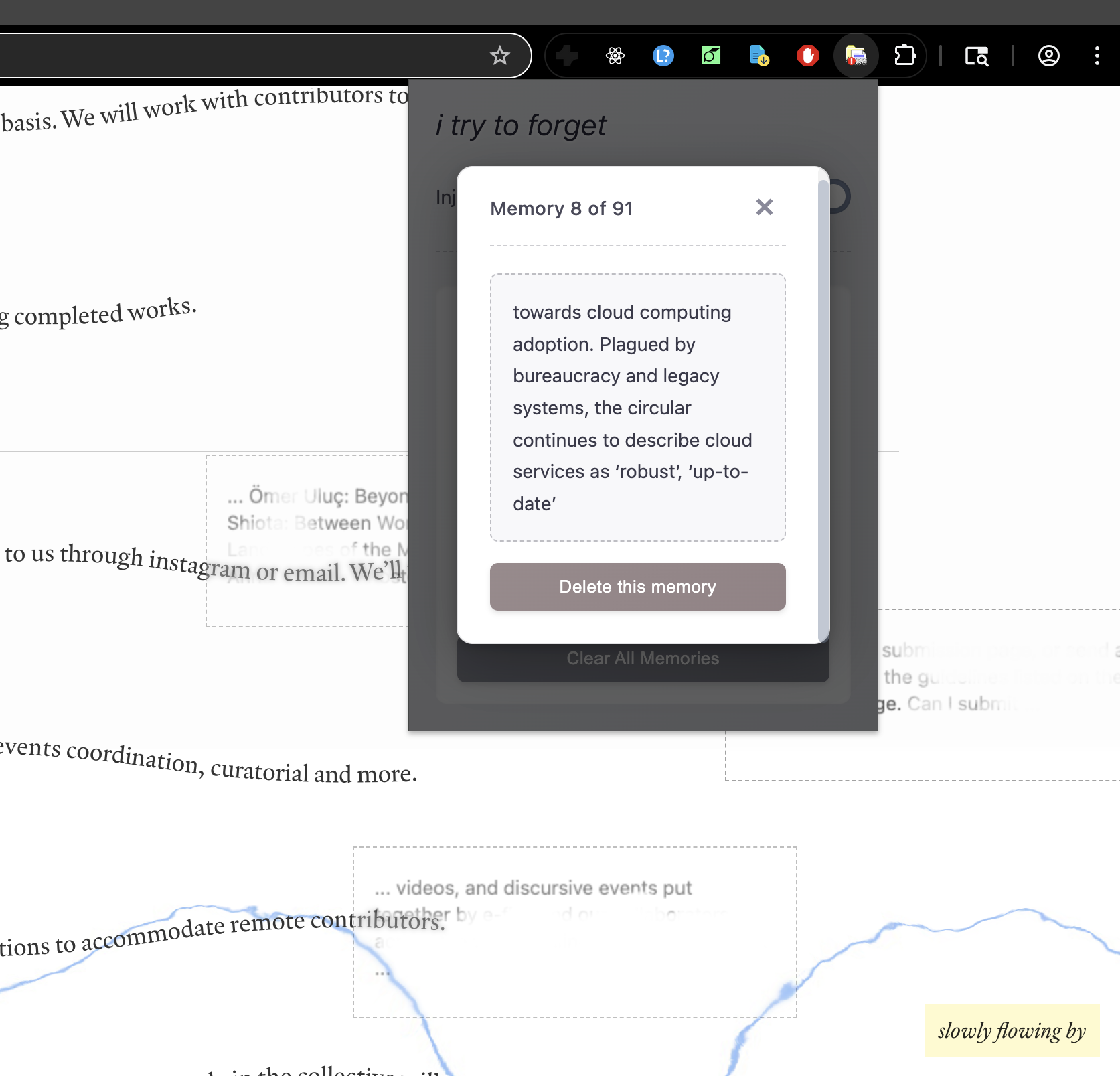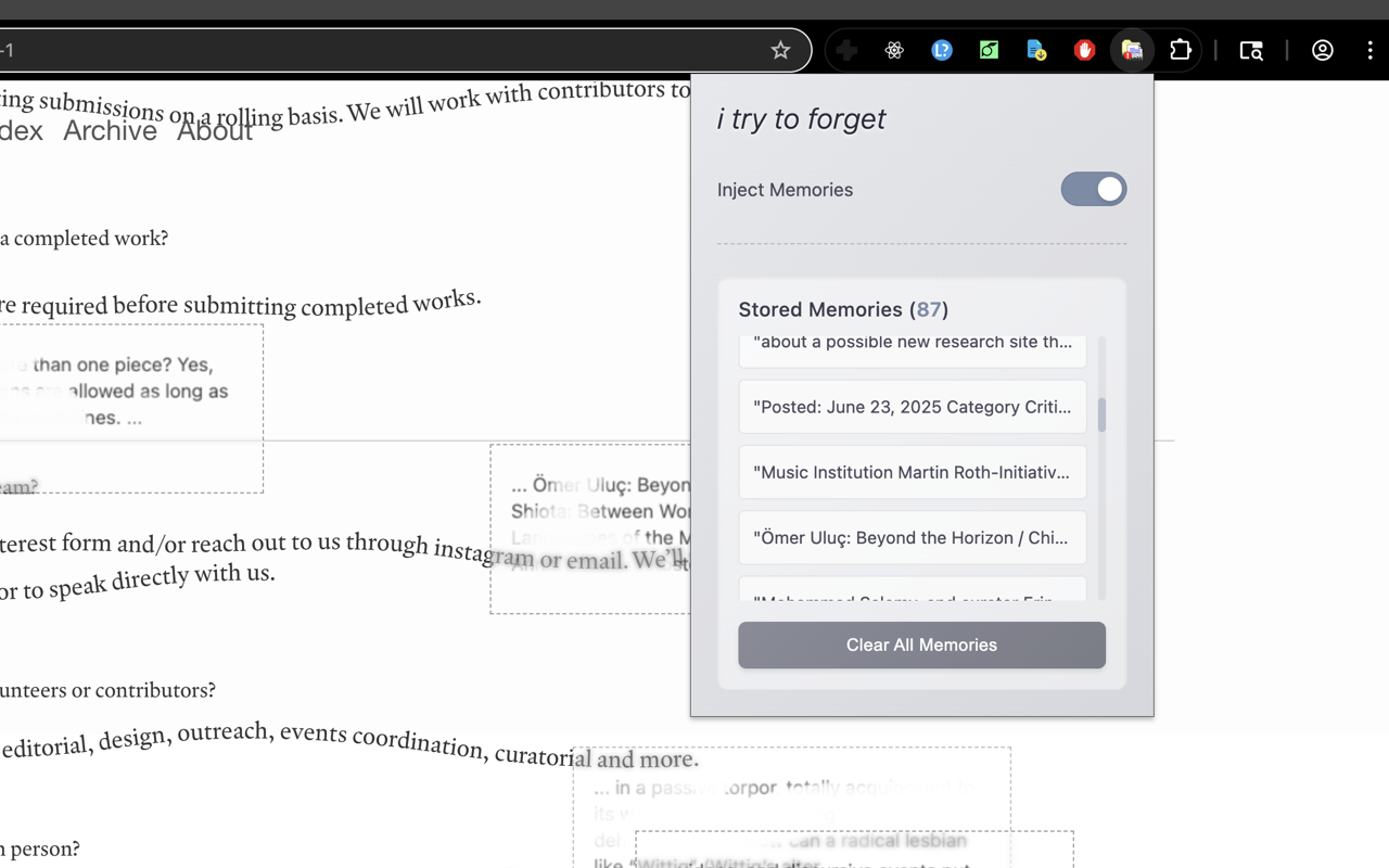 This project is a conceptual experimentation/intervention that explores the durational temporality and the disavowed materiality of digital interactivity. As you browse the web, the extension quietly collects memories (snippets of text and images) from the pages you visit. These memory fragments are then stored locally and periodically resurface on other pages you browse, appearing as semi-transparent overlays, like half-remembered thoughts.