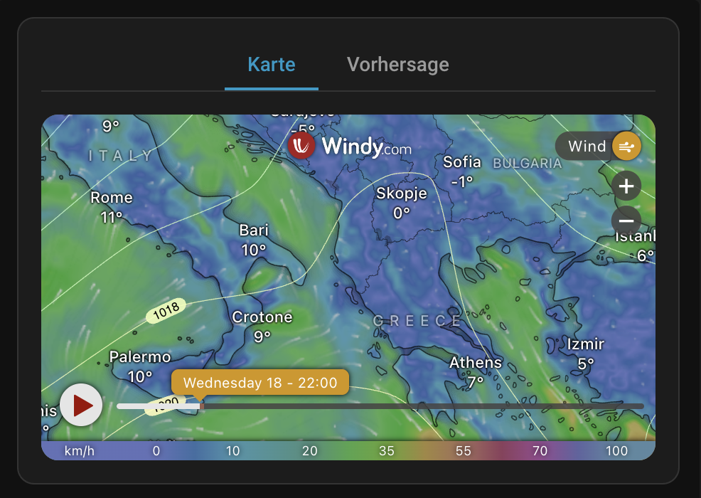 A Lovelace card that embeds the Windy.com interactive weather map and spot forecast directly into your Home Assistant dashboard.